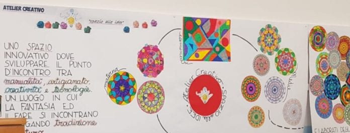 Sul tema della creatività è intervenuta la professoressa d’arte Cristina Romero che ha ideato e realizzato insieme ai ragazzi un cartellone, con i disegni preparati dai bambini dei tre ordini di scuola , che racchiudesse il significato dell’Atelier come “punto d’incontro “ tra creatività e tecnologie, come luogo in cui la fantasia e il fare possono far dialogare tradizione e futuro.